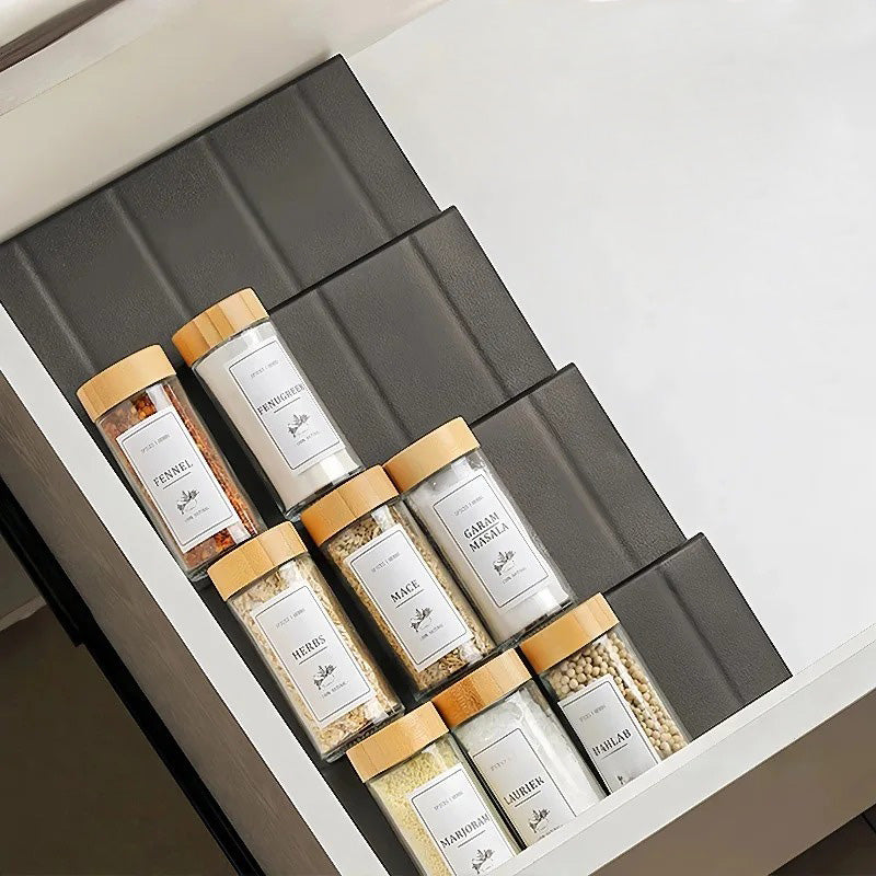 Optimisez chaque recoin de vos meubles grâce à un organisateur de tiroir modulable qui met fin au chaos, et accédez instantanément à vos saveurs préférées avec un rangement pour épices ergonomique.